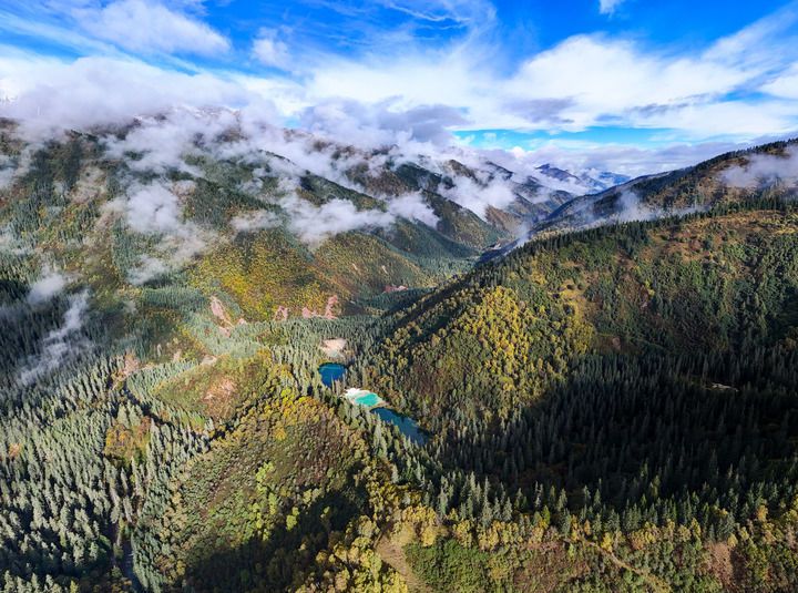 从九寨沟核心景区出发,沿国道向南行驶约26公里,车程30分钟即可领略爱情海湿地的静谧;从爱情海向东北方向行驶约1.5小时,穿越“28道拐”奇绝盘山路,便可探访神仙池的钙华奇观。