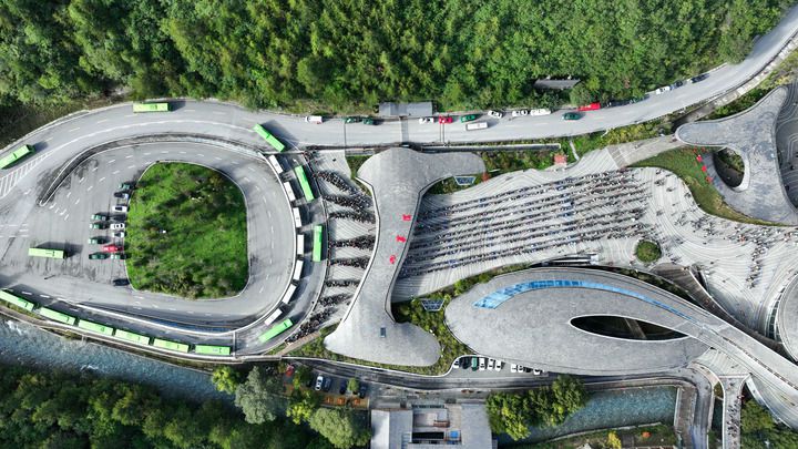 游客排队陆续进入九寨沟景区(2025年10月2日摄,无人机照片)。新华社发(梁枫摄)