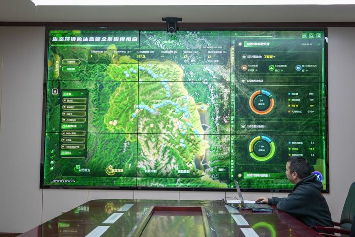 在九寨沟县生态环境局,工作人员在查看生态环境执法监管全景指挥平台(2025年11月17日摄)。新华社发(欧阳慧 摄)
