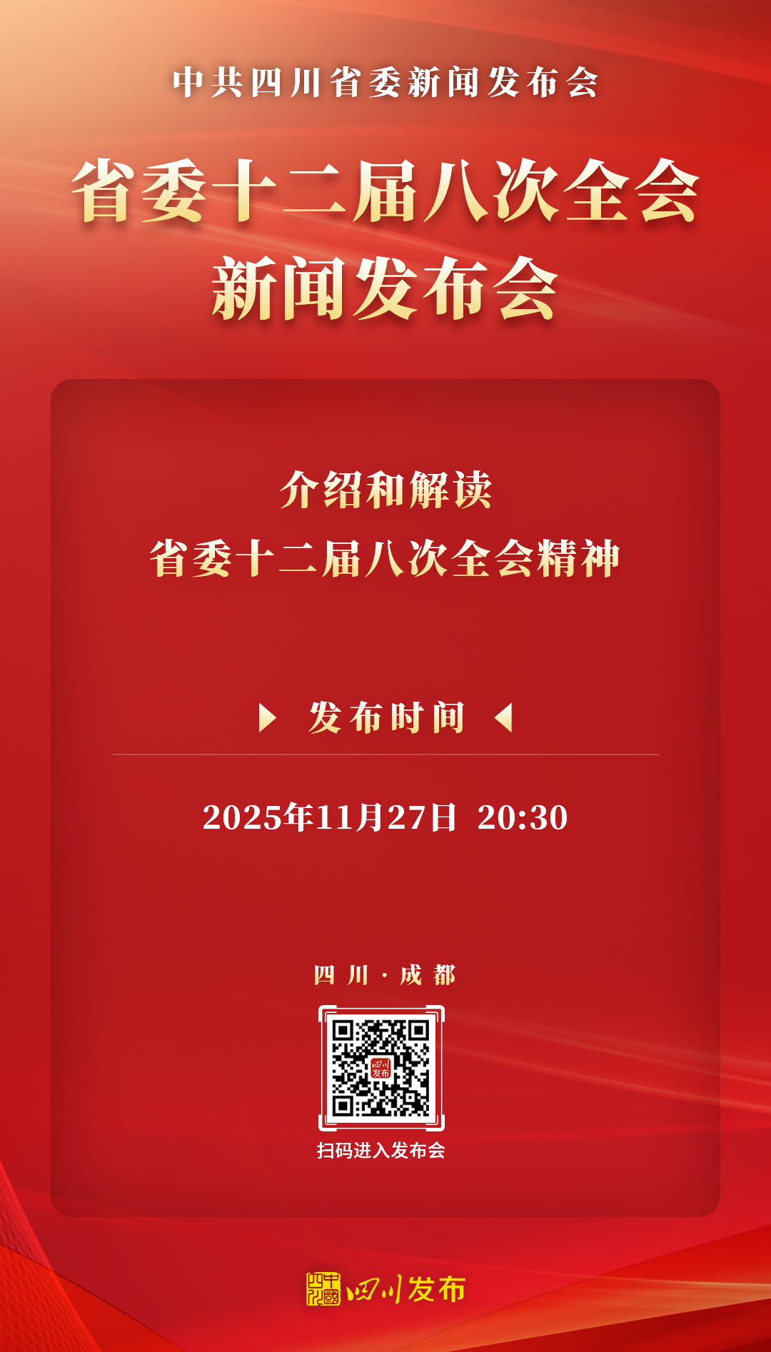 2025年11月27日(星期四)20:30,中共四川省委将在四川新闻发布厅举行新闻发布会,介绍和解读省委十二届八次全会精神。四川发布客户端将全程图文直播,敬请关注!