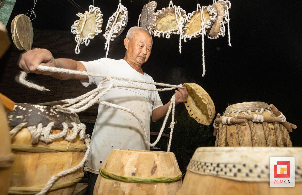 月光如水,铺满了富顺县福善镇月形村的一座农家院落。夜深人静时,这里总会传来“蹦、蹦、蹦”的敲击声——沉稳、绵长,像是从大地深处传来的心跳。一盏暖黄色的灯,照亮了堆满木料、牛皮与各式工具的工作间。72岁的刘衍清就俯身其间,手握木槌,一点一点地加固鼓身。他眼神专注,手上的动作细腻而坚定。檐下竹竿上,晾着一张张初具形态的牛皮鼓面,散发着淡淡的皮脂气味;身边大大小小的木鼓层层叠叠,如一群沉睡的音符,静候被唤醒的时刻。这间不算宽敞的工作室,正默默守护着一门跨越百年的非遗技艺。