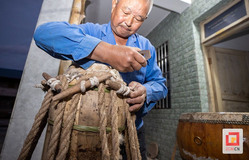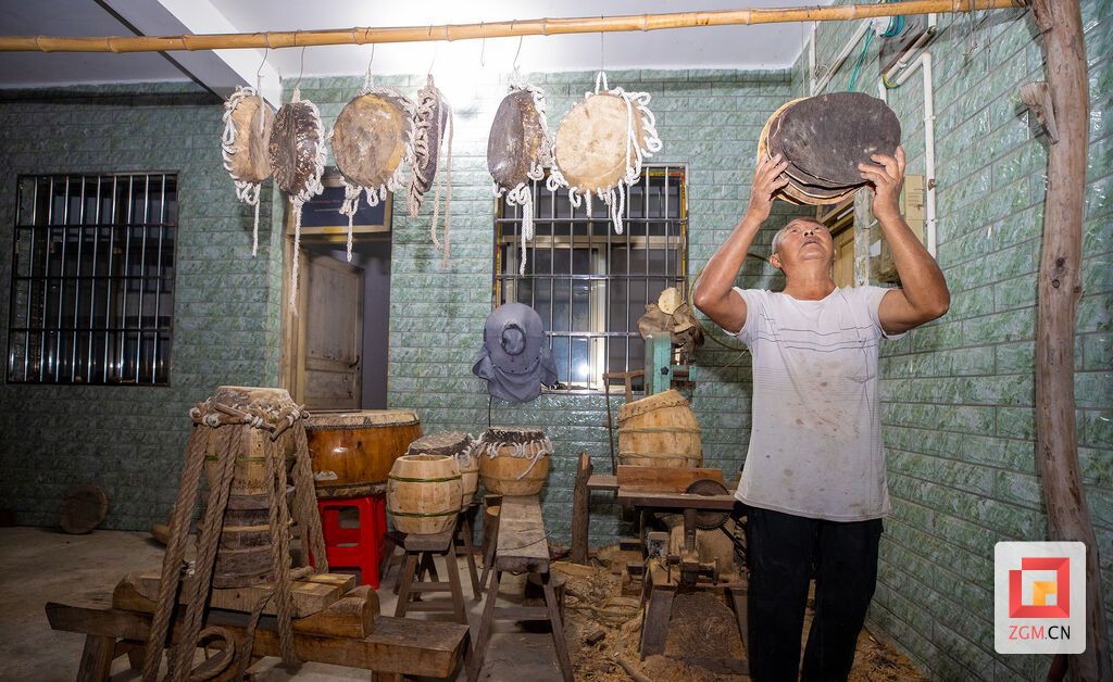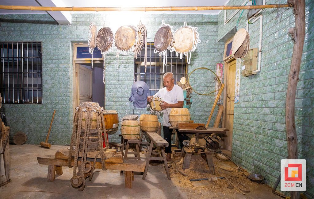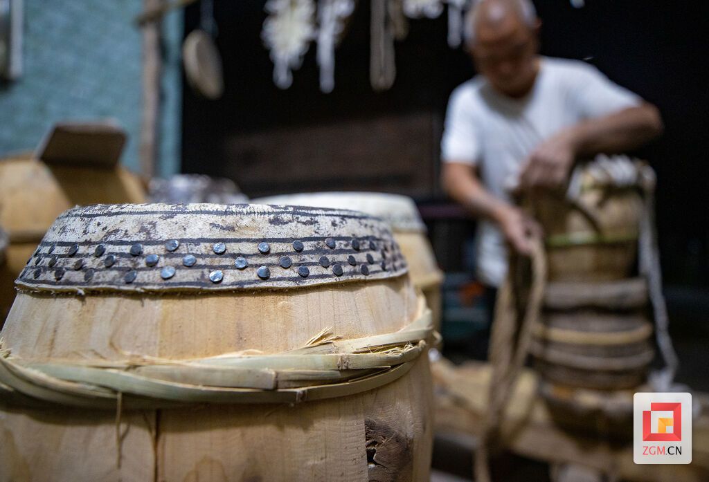 鼓皮如此,鼓身亦不简单。刘衍清至今仍亲自上山选木,多取质地坚实的白木。他将木料锯成弧形木块,再一一拼合、打磨成型。其中最见火候的,是箍桶定音。“紧了伤皮,松了音散。”他屏息凝神,木槌在鼓身与藤箍之间轻移慢敲,劲道不疾不徐。每一个细微的调整,都是几十年光阴凝练而成的直觉。从他手中诞生的牛皮鼓,形朴而音厚,声起时粗犷中透出深沉,一如他这个人——内敛,却有力量。