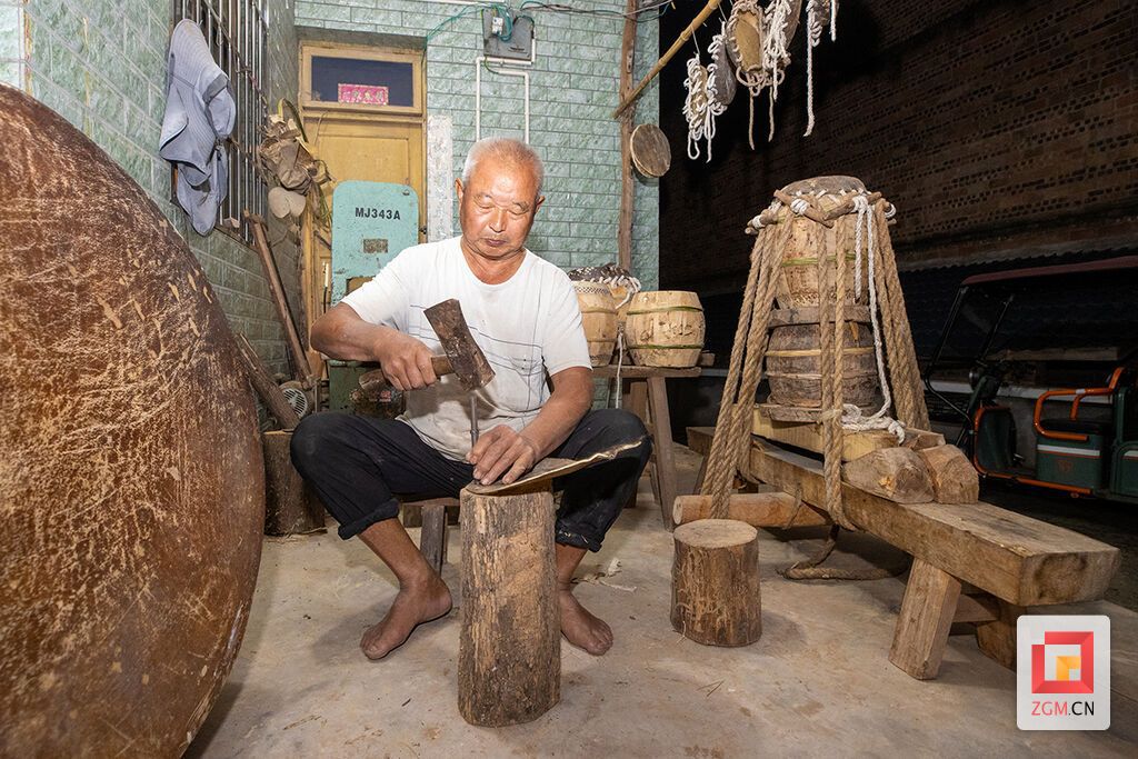 作为福善牛皮鼓制作技艺的第六代传人,也是目前自贡市这项非物质文化遗产的唯一代表性传承人,刘衍清从二十岁起便跟随父辈学艺。五十余载春秋过去,制鼓早已不只是他的手艺,更是他生命的延伸。“做鼓,是件磨性子的细活。”他一边说,一边用刀具细致地刮去牛皮内层的赘肉与杂毛。“从选材、撑皮、晒皮、下料,到削皮、浸泡、定皮、箍桶……二十多道工序,一步都省不得,一步也急不来。”