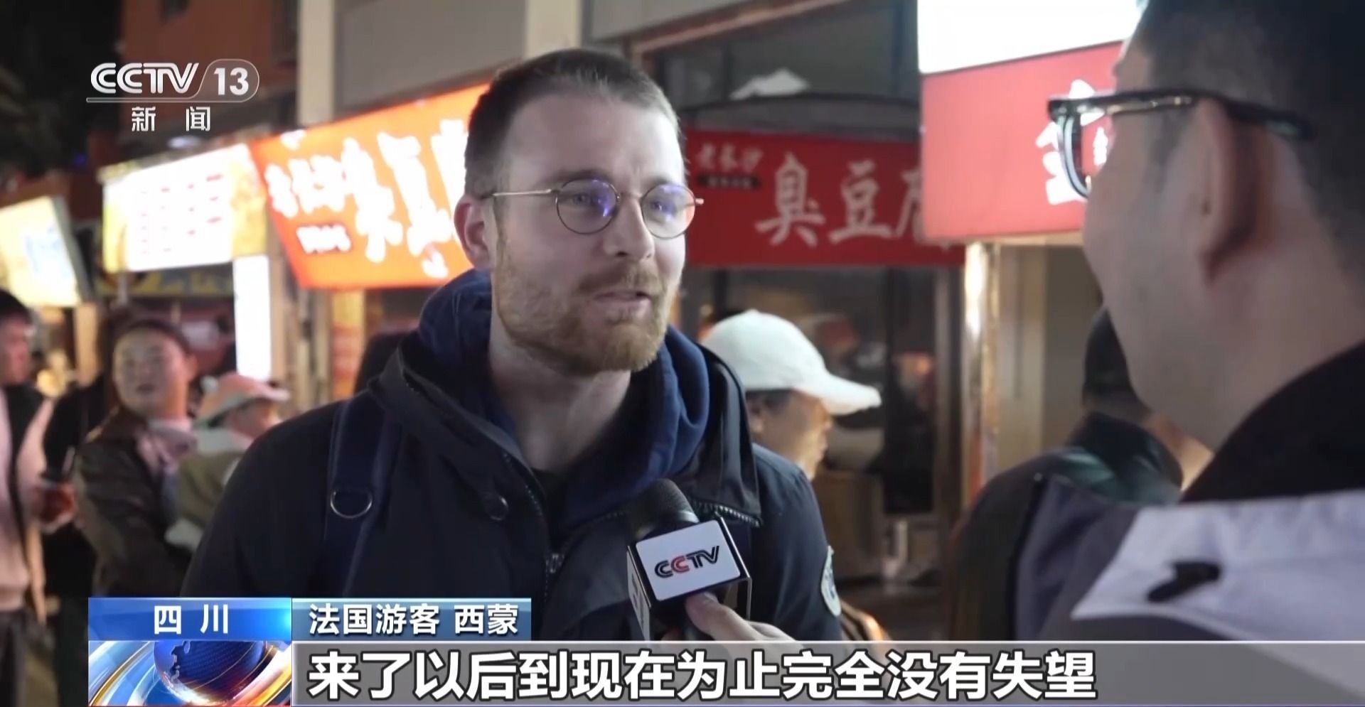 法国游客 西蒙:来了以后到现在为止完全没失望,有好多美食等着我们品尝。我其实挺意外的,夜市里真的特别干净。