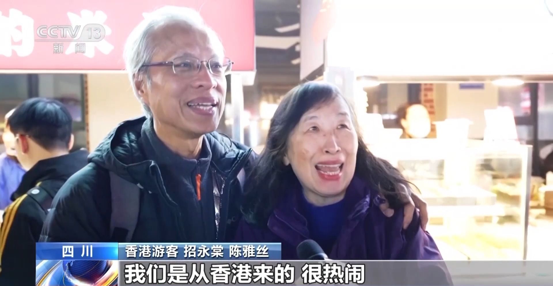 香港游客 招永棠 陈雅丝:我们是从香港来的,很热闹,很多东西可以吃,很新鲜。