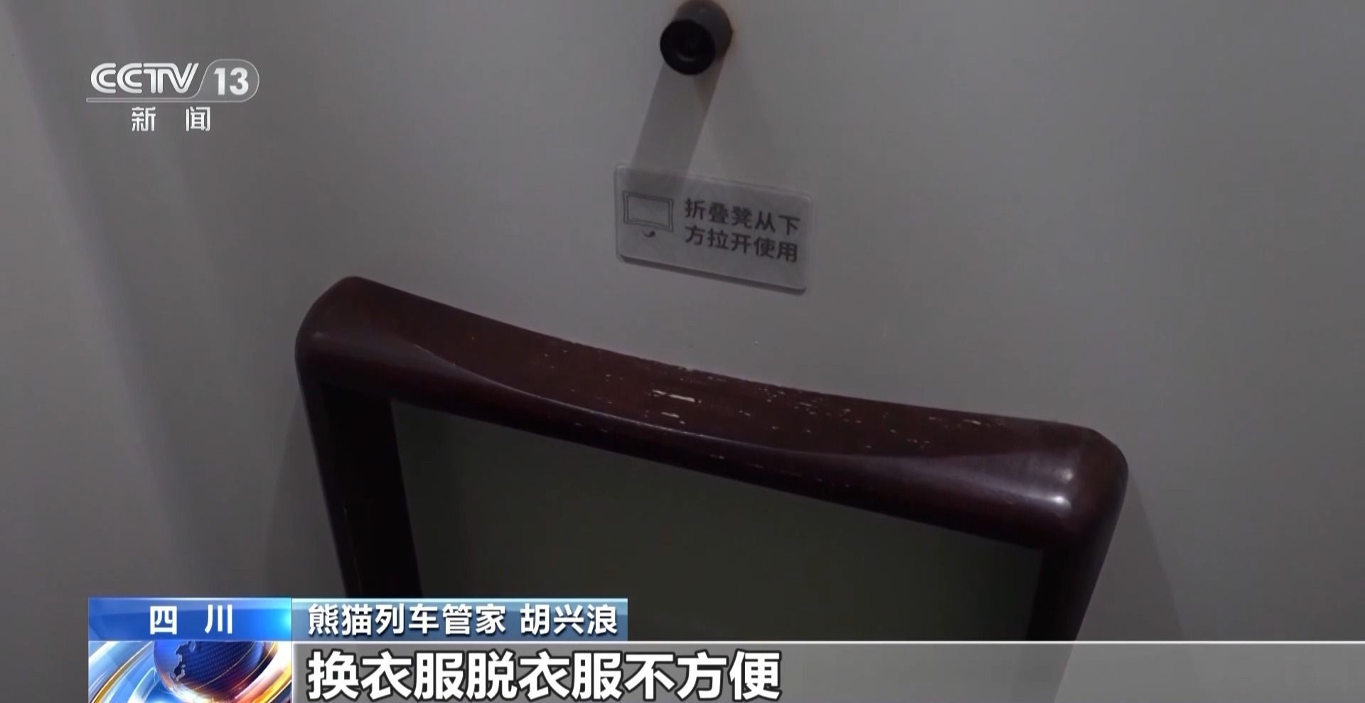 熊猫列车管家 胡兴浪:这边有一个座椅,车上会晃动,老年人换衣服脱衣服不方便,可以坐着更换。还准备了紧急呼叫按钮,我们可以第一时间接到警报。