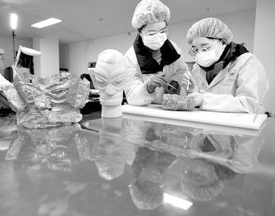 文物保护修复人员在清除青铜面具上的附着物。新华社发