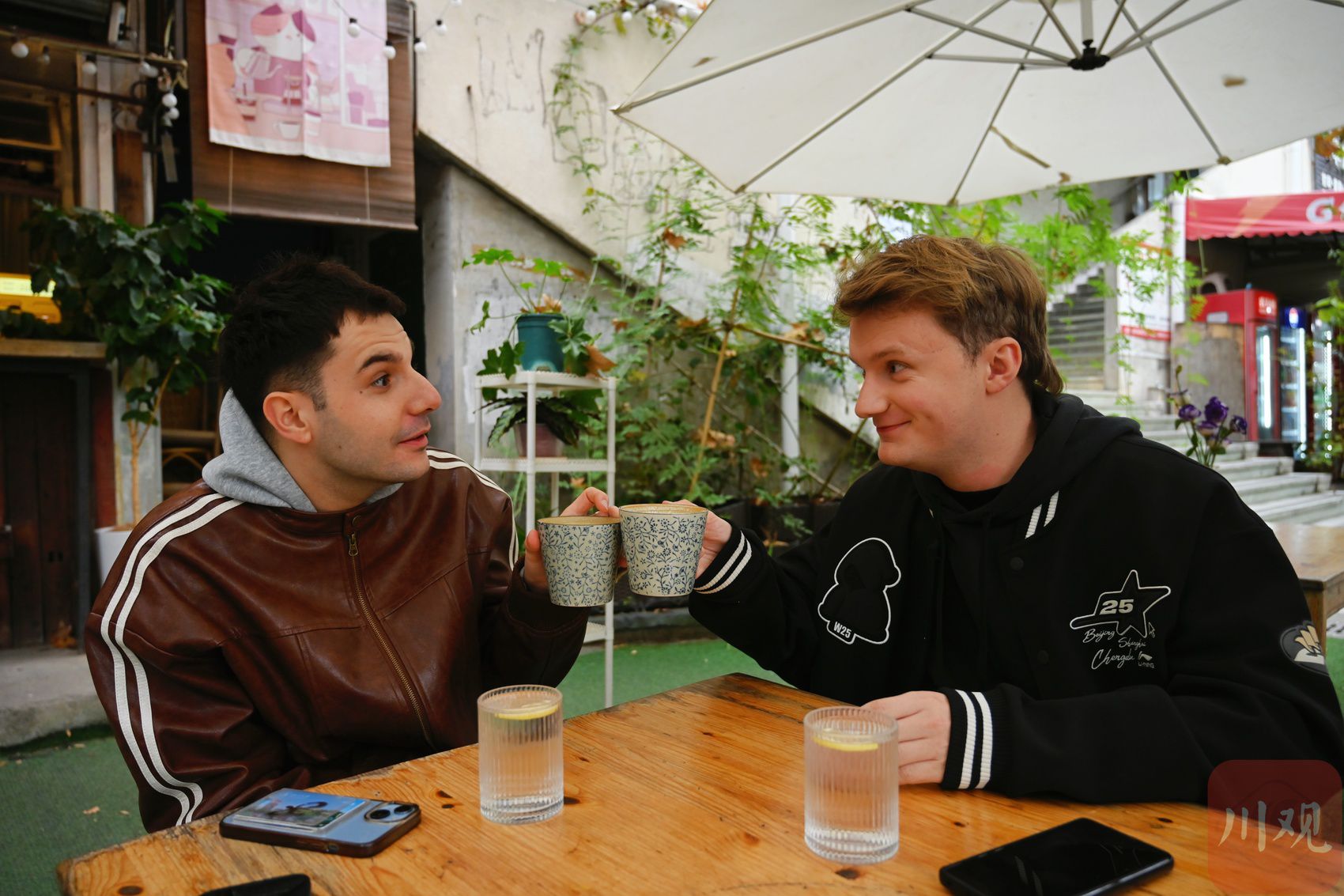 Martin(左)和Romain(右)一起在成都街头喝咖啡