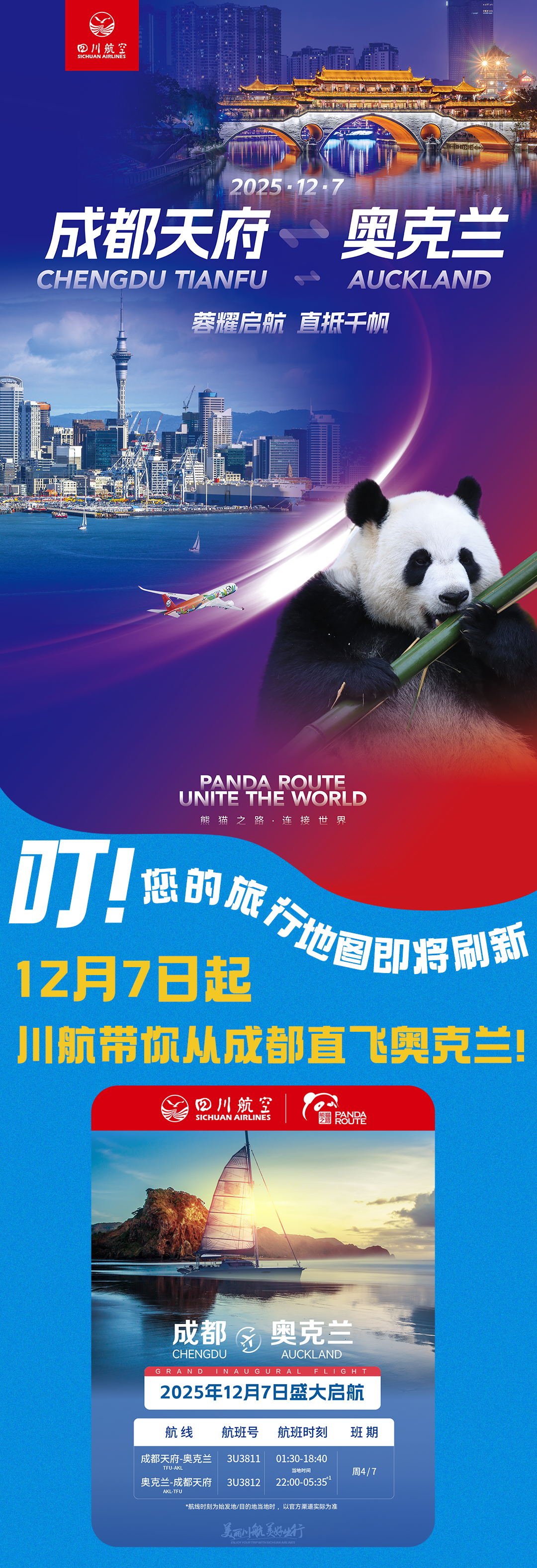 此次复航不仅加密至每周两班,更启用A350超宽体客机执飞。成都往返奥克兰航班号为3U3811/3U3812,每周四、周日执飞,单程飞行时间约12—13小时。去程3U3811于01:30从成都天府国际机场起飞,当地时间18:40抵达奥克兰;返程3U3812于22:00从奥克兰起飞,北京时间次日05:35抵达成都。旅客抵蓉后可依托天府机场高效中转体系,实现当日衔接北上广深、拉萨、厦门等国内重点城市,出行便捷度全面提升。