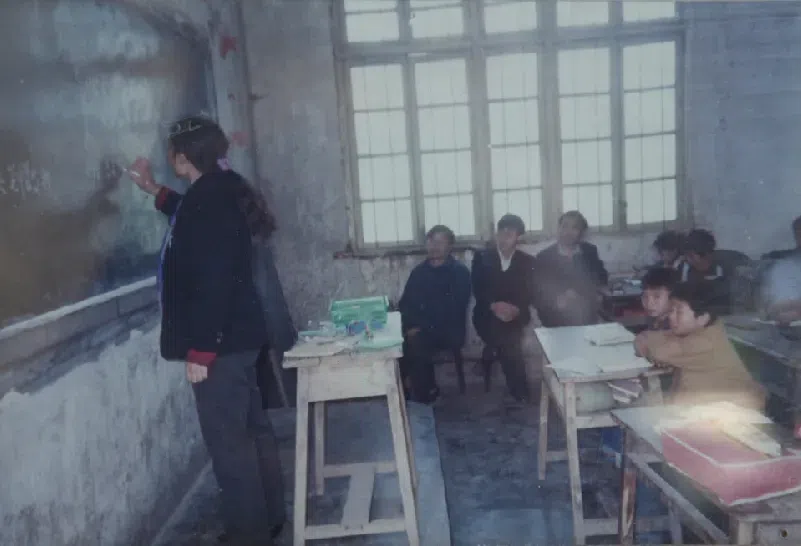 当年学生们在银杏木打造的课桌上学习(受访者供图)