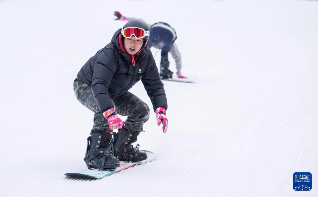 2月8日,游客在阿坝州汶川县羌人谷滑雪场滑雪。