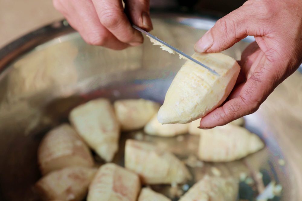 处理环节就是一门技艺。她取出一颗冬笋,菜刀沿笋尖至根部轻划一刀,双手顺势一转,层层笋壳应声脱落,露出象牙白笋肉,再用小刀细细刮去表面绒毛。
