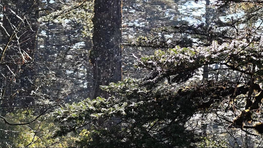 从山脚乘坐缆车上行,能明显感受到气温逐渐下降。目前瓦屋山景区鸳鸯池一带已可见积雪,但整体雪量还不算厚重,更像是冬日的一次“轻描淡写”。森林栈道两侧,松枝和冷杉上挂着薄薄一层雪霜,鸳鸯池局部结了一层薄冰。