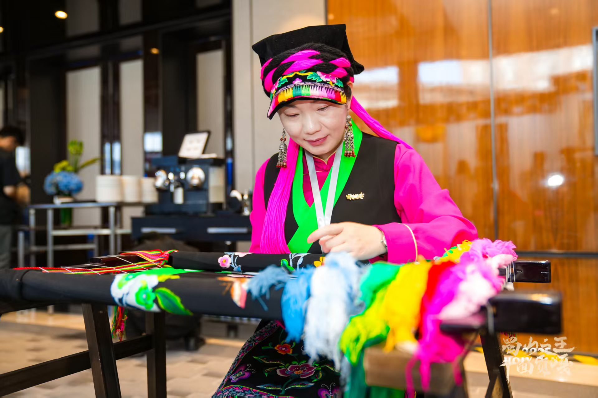 赵松梅是一名“80后”,为了迎接客人,她特意穿上了自己亲手制作的民族服装。她把客人领进刺绣坊,里面的作品琳琅满目:传统的头帕、腰带、荷包、布鞋,还有融合了民族元素的现代生活用品,如刺绣背包、手提包、钱包、领带等。