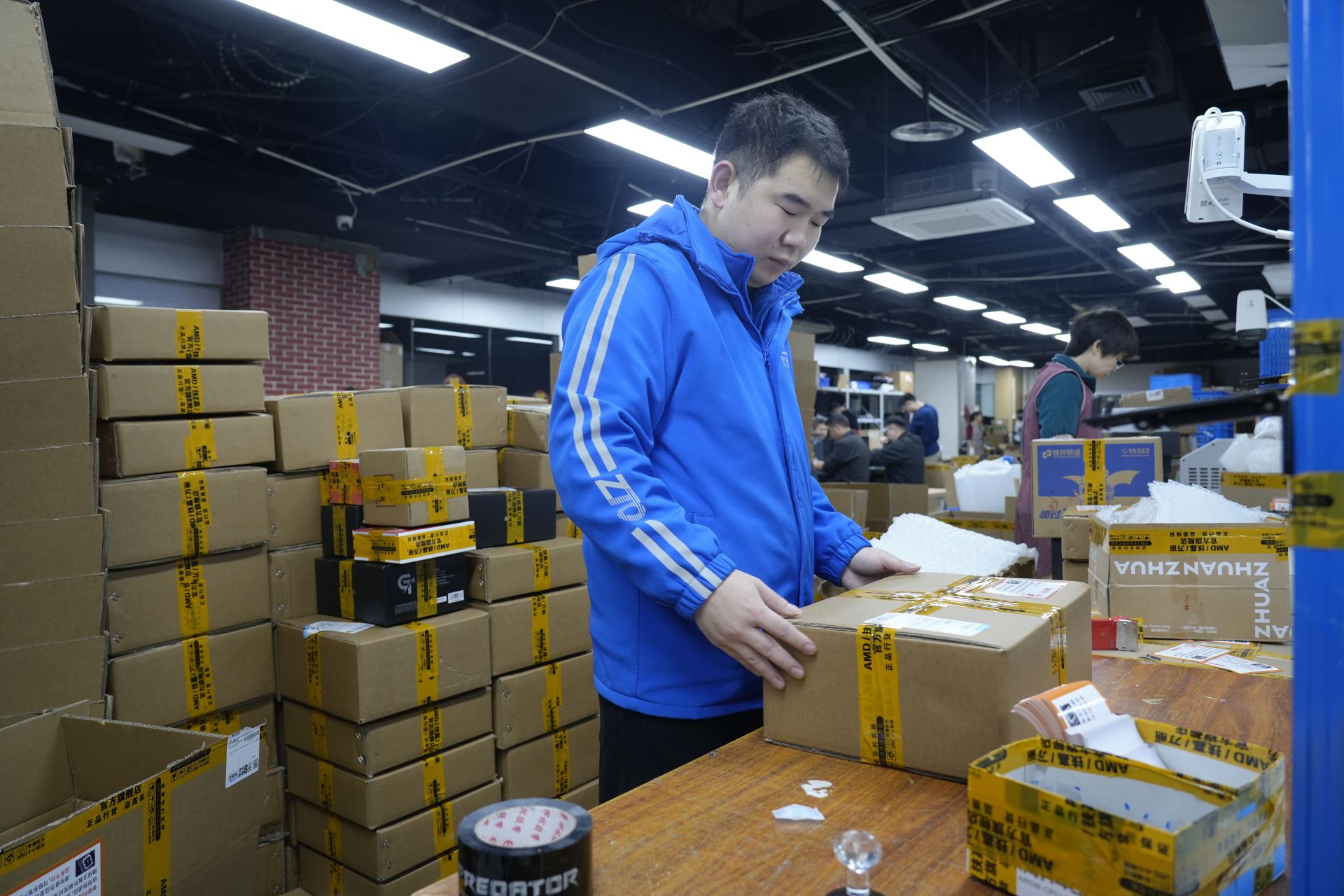 这个显卡的发件人,是电脑城五楼的成都蜀码科技有限公司。运营主管沈震江在仓储区预估着今天的订单,旁边员工忙碌着——技术员在组装和测试整机,打包工位胶带撕扯声此起彼伏。