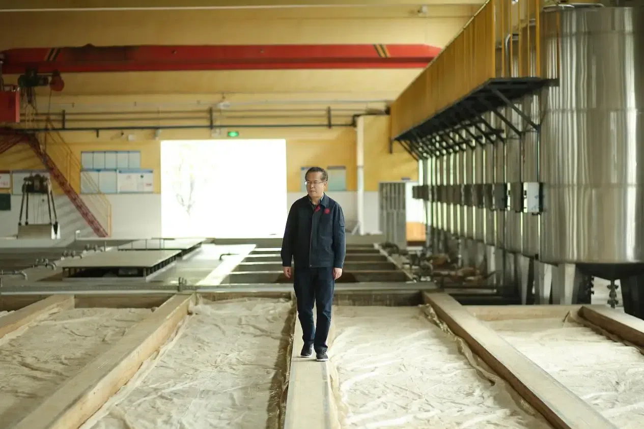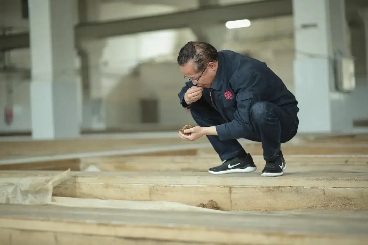 发酵车间里,一排排整齐的水泥发酵池见证着时光的魔法。杨勇俯身抚摸池壁,指尖一边感受着温润的温度,一边和记者讲解道:“别小看这35天的发酵周期,这里藏着‘阴阳调和’的学问。前半段厌氧发酵产酒精,后半段有氧发酵转醋酸,温度和水分必须拿捏精准。以前老师傅全靠手抓、鼻闻、嘴尝,现在有了科技助力,我们把关键数据标准化,但翻炒、控温这些核心环节,还得守着老规矩。”