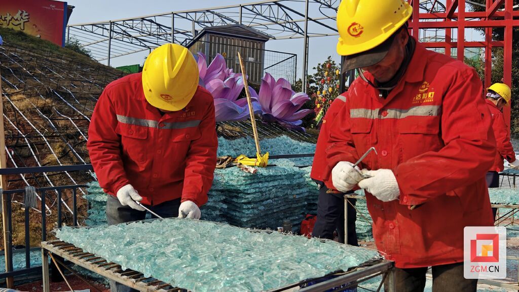 “固定这些‘小盐晶’同样充满挑战。”温易桃介绍。工人们需将玻璃石一粒粒地用钢丝网精心固定,工艺极为精细,平均每人每天仅能完成约两平方米。其下铺设的灯带将在夜晚亮起,届时整片“盐田”将折射出梦幻绚丽的光影,成为木兰故事舞台的独特基底。