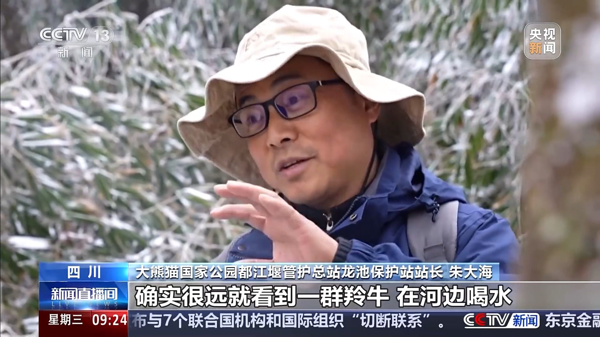 大熊猫国家公园都江堰管护总站龙池保护站站长 朱大海:走到快到河边的时候,很远就看到一群羚牛在河边喝水,大概有三四十头。所以向导看我跑了几步,他就说你快上树。向导跟我说,你今天如果被羚牛追上了攻击了,不把你弄死也把你弄废。