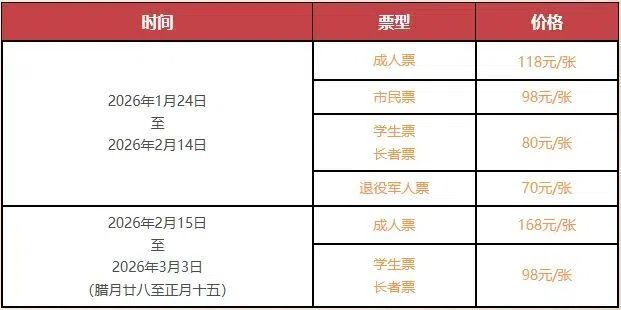 1月24日至2月14日、3月4日至灯会闭幕实施平谷期挂牌价,成人票118元/张,长者票、学生票80元/张。此外,平谷期还专门设有面向自贡、内江市民的98元市民票,以及70元的退役军人票,满足不同游客群体的多元需求。