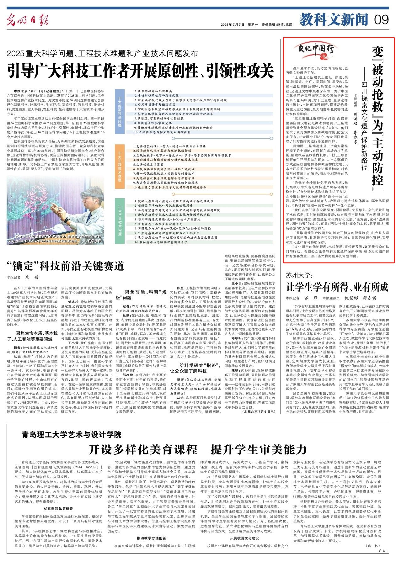 “土遗址包括建筑土遗址、古城、关隘、陵墓等。它们力学强度低,易受水、风和可溶盐的侵蚀破坏,易在水中崩解、松散,是遗址文物中最难保存的一类。”中国文化遗产研究院国家文化公园保护研究所所长张兵峰说,对于三星堆、金沙这样的土遗址,当地正加强预防,将被动抢救转变为主动防控,最大限度降低灾害对遗址本体的影响。