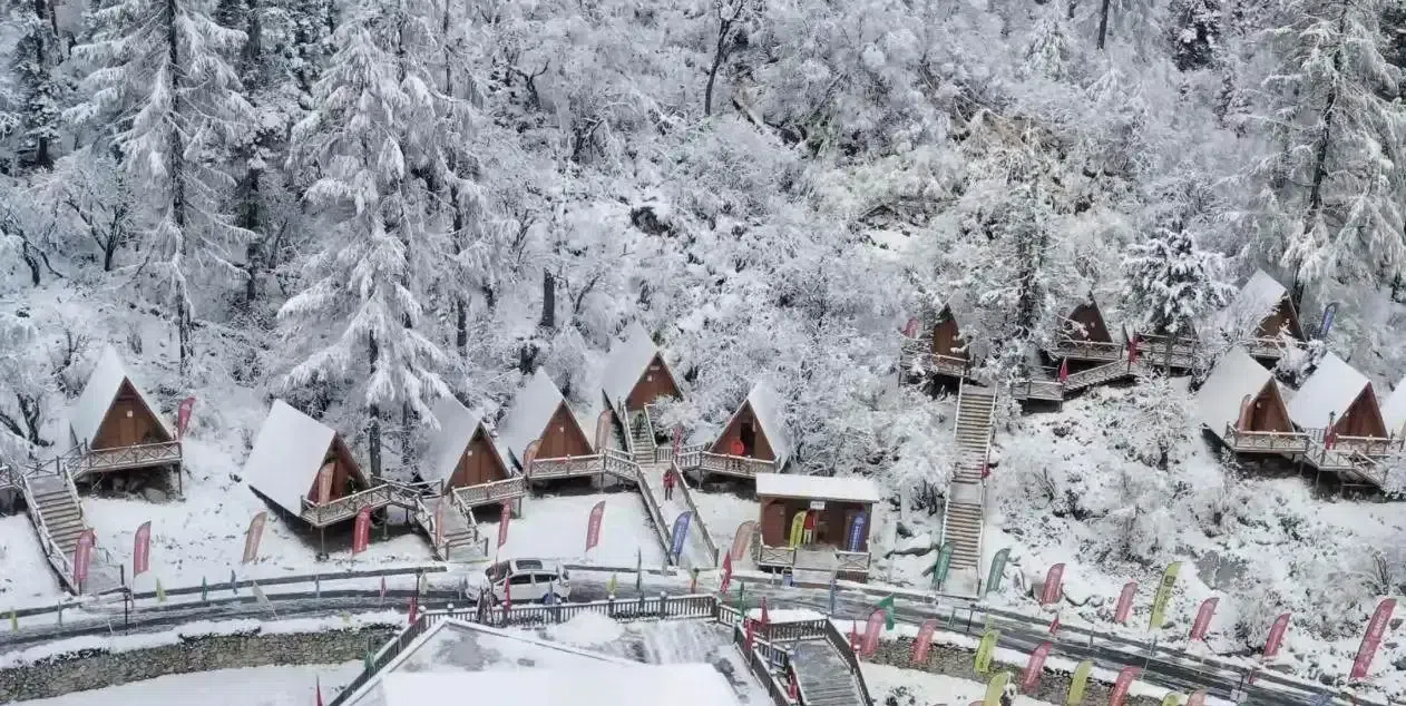 雪中的三奥雪山大本营,宛如童话小镇。
