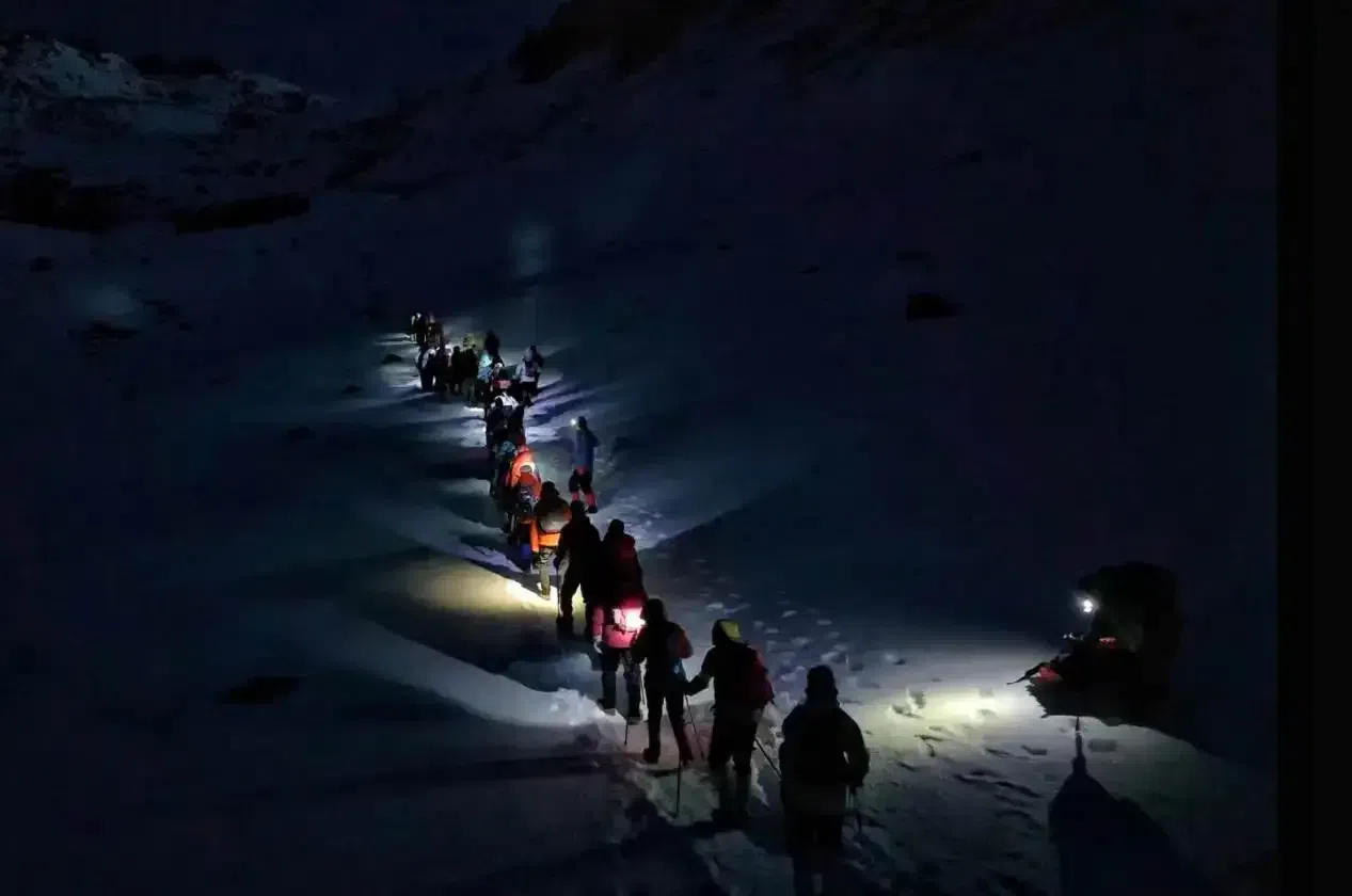 登山客凌晨出发攀登奥太娜峰