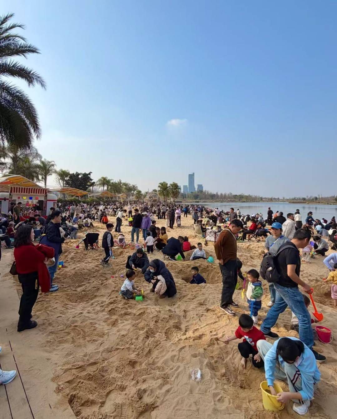 前一天,她带孩子去了东安湖银沙滩。本想着趁假期放松一下,没想到刚到不久,就意识到自己“低估了这座城市的热度”。眼前,沙滩上密密麻麻全是小朋友,五彩的小桶、小铲子铺了一地。她转头看见自家孩子正蹲在沙堆里专注“施工”,小脸脏兮兮却笑得灿烂。那一刻,她感慨:这种“人山人海”,其实正是年味的另一种注脚。