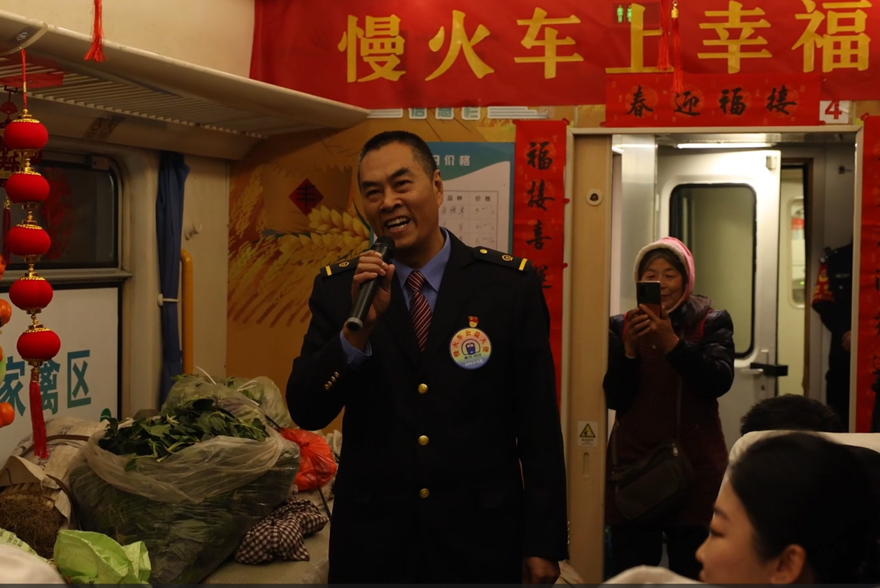 6063/6064次列车全程344公里,平均时速不足40公里,往返一趟需24小时,沿途串联起33个乡镇车站,成为连接山区与外界的“民生线”“致富线”。今年春运期间,向宝林受邀重返岗位,在熟悉的车厢里与乘客共度新春。火车缓缓停靠在了广元朝天南站后,搭车的乘客一上车就认出向宝林。