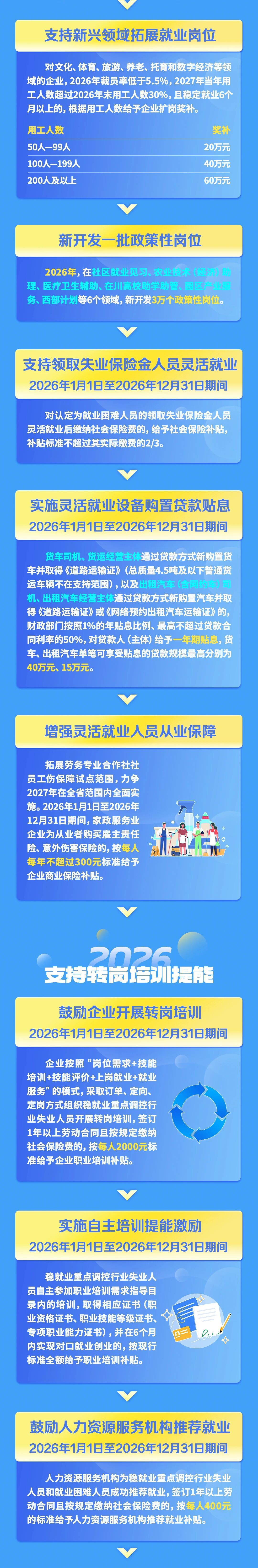 注重挖潜拓新。在拓展就业岗位方面,《政策措施》特别注重在新竣工投产企业和新兴领域企业拓展就业增量。比如,对2026年期间新竣工投产企业,按招用人数分档给予企业招工激励,单户企业最高不超过100万元;对文化、体育、旅游、养老、托育和数字经济等领域的企业,2026年裁员率低、2027年用工人数增加,且稳定就业6个月以上的,根据用工人数分档给予企业扩岗奖补,最高奖补60万元。