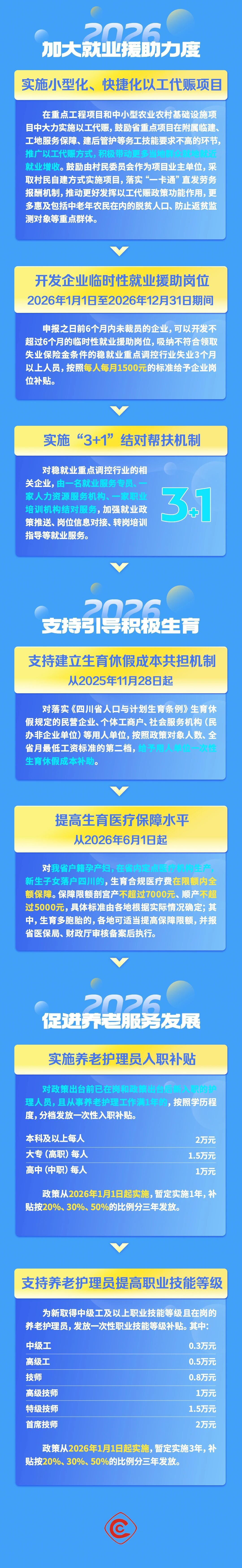 在促进养老服务发展方面,《政策措施》提出,实施养老护理员入职补贴、支持养老护理员提高职业技能等级。2026年起,对已在岗和新入职的,且从事养老护理工作满1年的,按学历程度分档发放一次性入职补贴,补贴资金分3年发放,最高补贴2万元;2026年起,对新取得中级工及以上职业技能等级且在岗的养老护理员,按取得的职业技能等级分档发放一次性职业技能等级补贴,补贴资金分3年发放,最高补贴2万元。