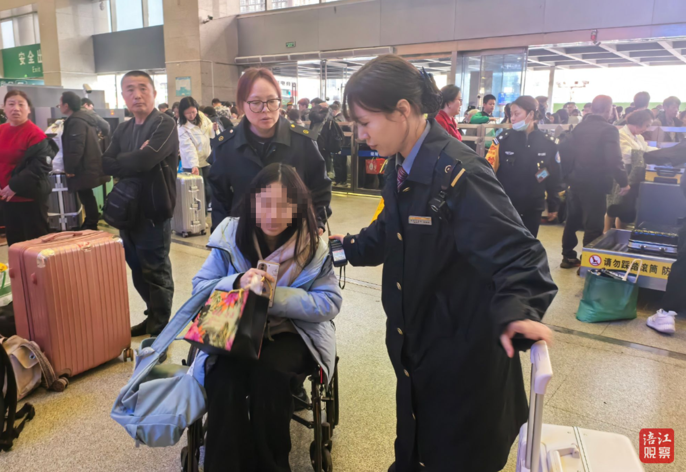 “重点旅客邓先生已抵达进站口会合点,请轮椅协助。”对讲机里,进站口同事的声音急促传来。眼看时间紧迫,自动扶梯上人潮拥挤,李璐君与同事片刻不停,快步从站台一路小跑赶往进站口,全程护送邓先生乘坐直达电梯进入候车室,协助完成检票手续,一路将他平安护送至前往上海的列车车厢落座后,才转身匆匆离去。