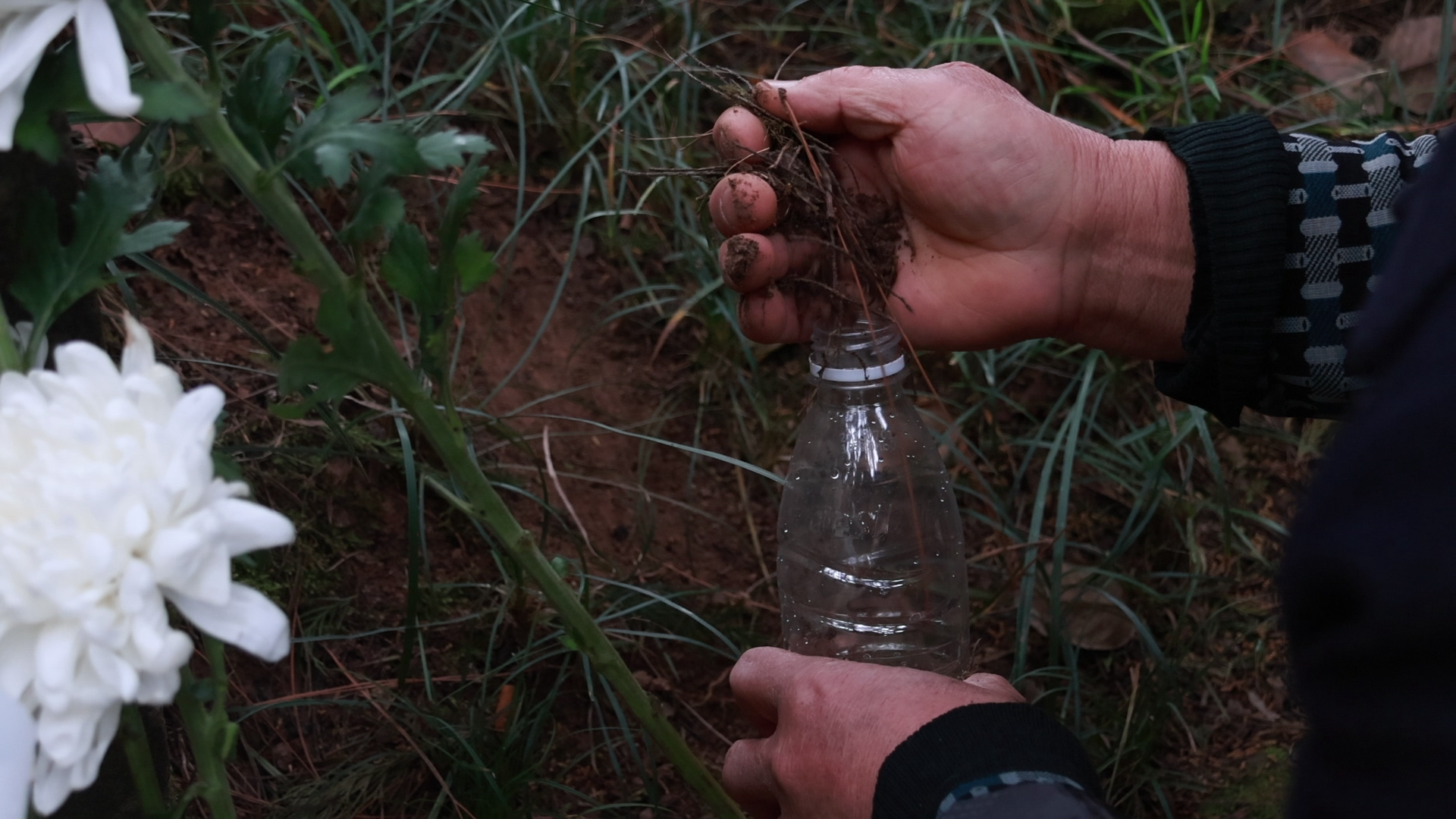 面对墓碑,已经70岁的唐德军及家人依次上前,恭敬献花、虔诚磕头。唐德军缓缓拿出随身携带的瓶子,俯身轻轻捧起一抔墓前的泥土,小心翼翼装入瓶中。他望着墓碑,声音哽咽却又无比坚定地说道:“幺爷爷,我带一些您墓前的泥土回去,安放在您父母的坟前,跟我们回家吧。”