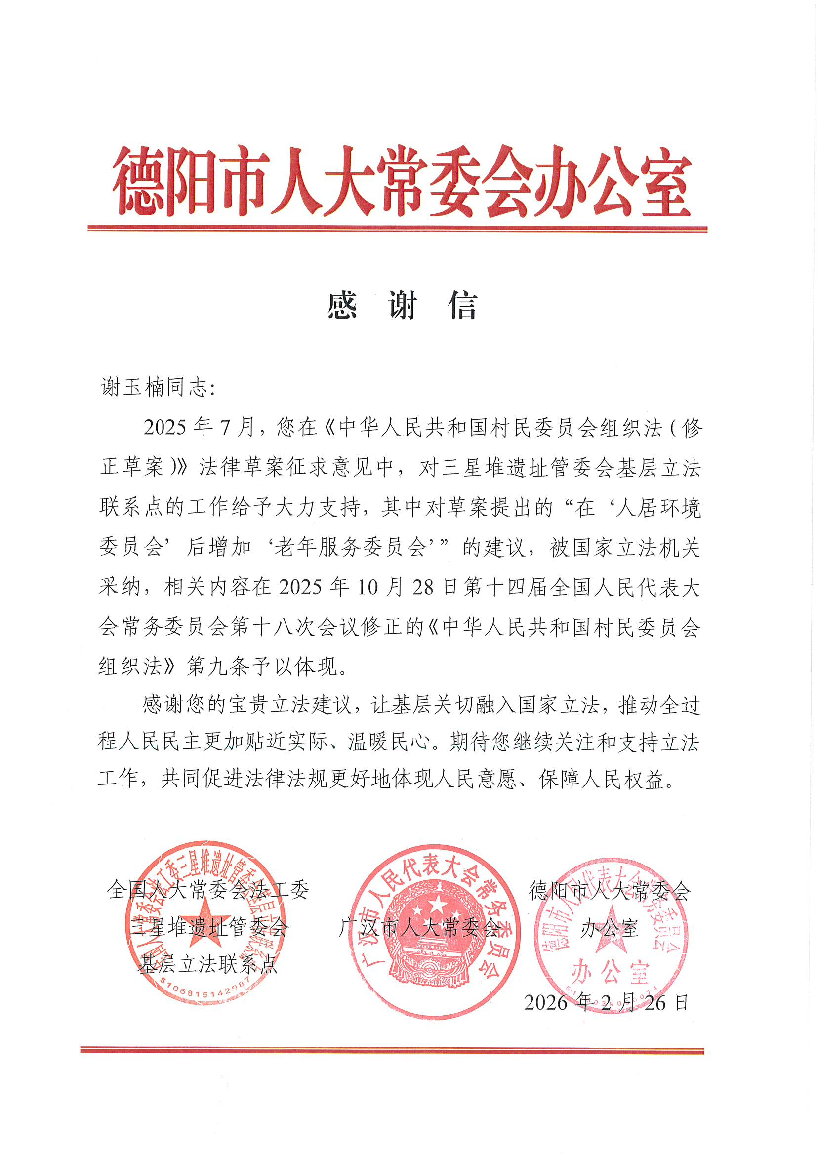 “没想到自己提的建议能变成国家的法条。”手捧感谢信,谢玉楠感慨不已。她相信,未来还会有更多沾着泥土、带着露珠的基层声音,从三星堆出发,直达国家立法殿堂,持续书写全过程人民民主的德阳实践。