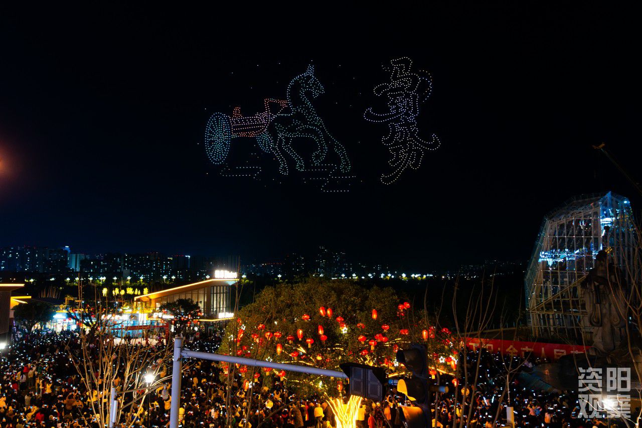 无人机组成的资阳铜车马和“马到成功”字样。全媒体记者 张建 摄
