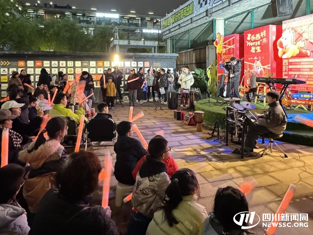 3月1日(农历正月十三),晚上八点,成都西村大院的空中跑道上仍有不少夜跑的人。楼下,邻里小广场传来吉他和歌声,里三层外三层围满了观众;一旁的拾光与烟火烧烤小酒馆里,觥筹交错,室外座无虚席。