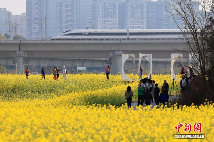 3月4日,列车从四川成都锦江大道一侧花海中穿过,吸引不少民众前来打卡。动车组列车与大片油菜花田同框出现,被市民称为“开往春天的列车”。中新社记者 张浪 摄
