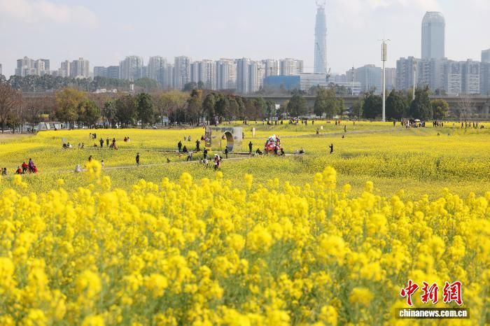 3月4日,初春时节,四川省成都市锦江大道一片油菜花海迎来最佳观赏时期,城市建筑与花海交相辉映,吸引市民打卡。中新社记者 张浪 摄
