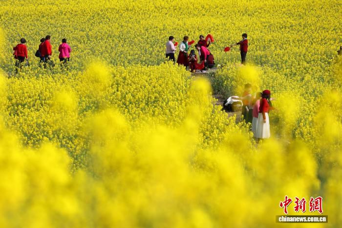3月4日,初春时节,四川省成都市锦江大道一片油菜花海迎来最佳观赏时期,吸引市民打卡。中新社记者 张浪 摄
