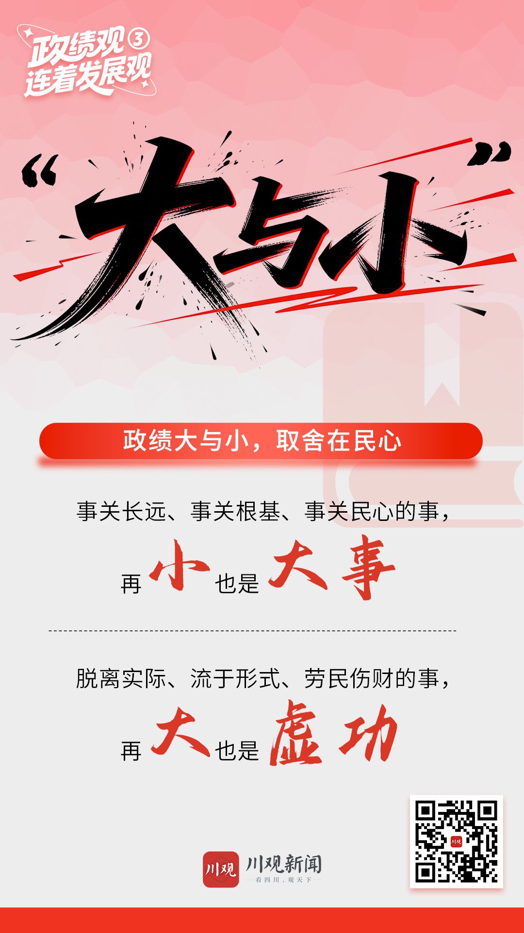 从我们党的初心使命出发,政绩的大与小,从来不以地位、体量、场面乃至一时的成效来衡量,而在于是否真正造福人民。事关长远、事关根基、事关民心的事,再小也是大事;脱离实际、流于形式、劳民伤财的事,再大也是虚功。