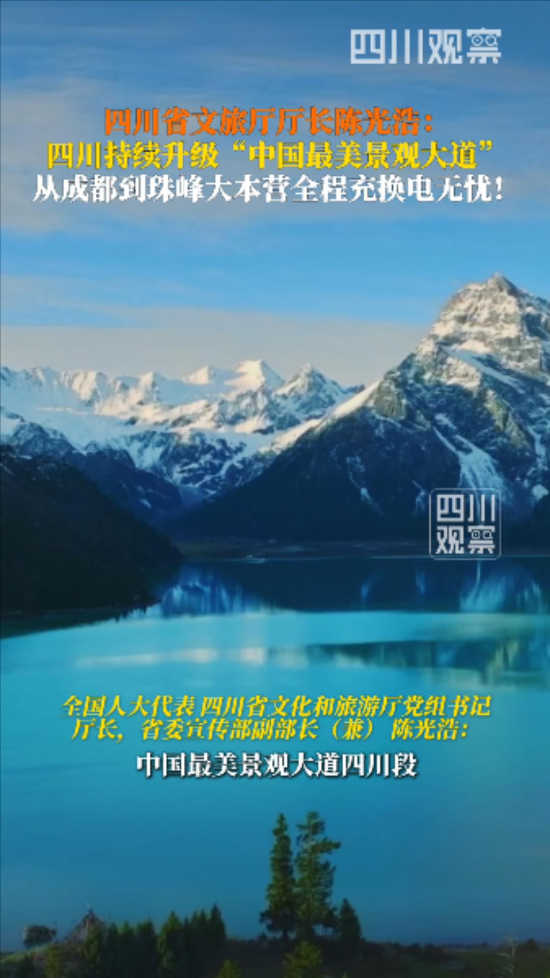 3月6日,十四届全国人大四次会议四川代表团举行开放团组活动。全国人大代表、四川省文化和旅游厅党组书记、厅长,省委宣传部副部长(兼)陈光浩表示,四川正着力优化完善国道318、317线及“中国最美景观大道”四川段的旅游公共服务体系,目前已试点建成8个高原旅游驿站,新建及改扩建旅游厕所超过300座,实现了从成都至珠峰大本营全程充换电服务的无缝衔接。