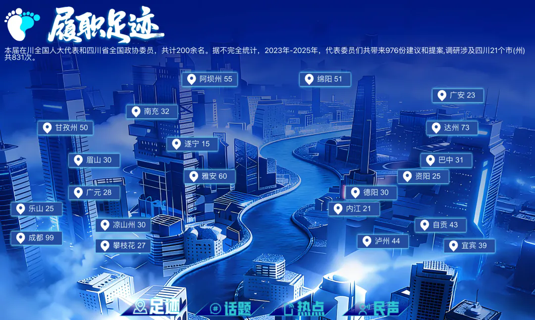 据不完全统计,2023-2025年期间,200余名在川全国人大代表和四川省全国政协委员,走进田间地头、走进科研一线、走进工厂车间调研,足迹遍布全省21个市(州)多达831次,为民情民意建言,为经济发展献策。一次次调研足迹,转化成为976份建议……3月6日,四川新传媒集团推出的《数说履职》,带你透过一组组数字,读懂背后的履职初心与民生温度。