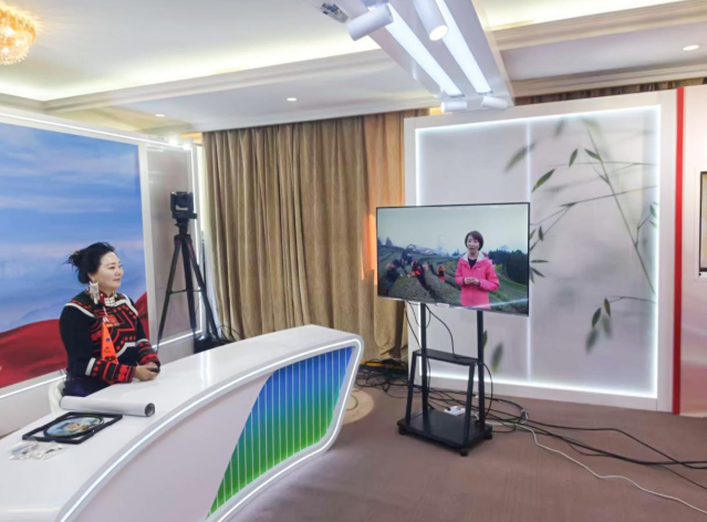 乔进双梅在“天府融媒智慧共享空间”云技术平台演播室连线家乡