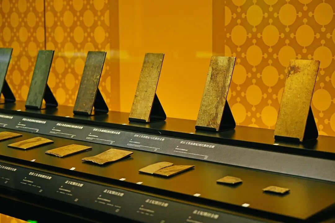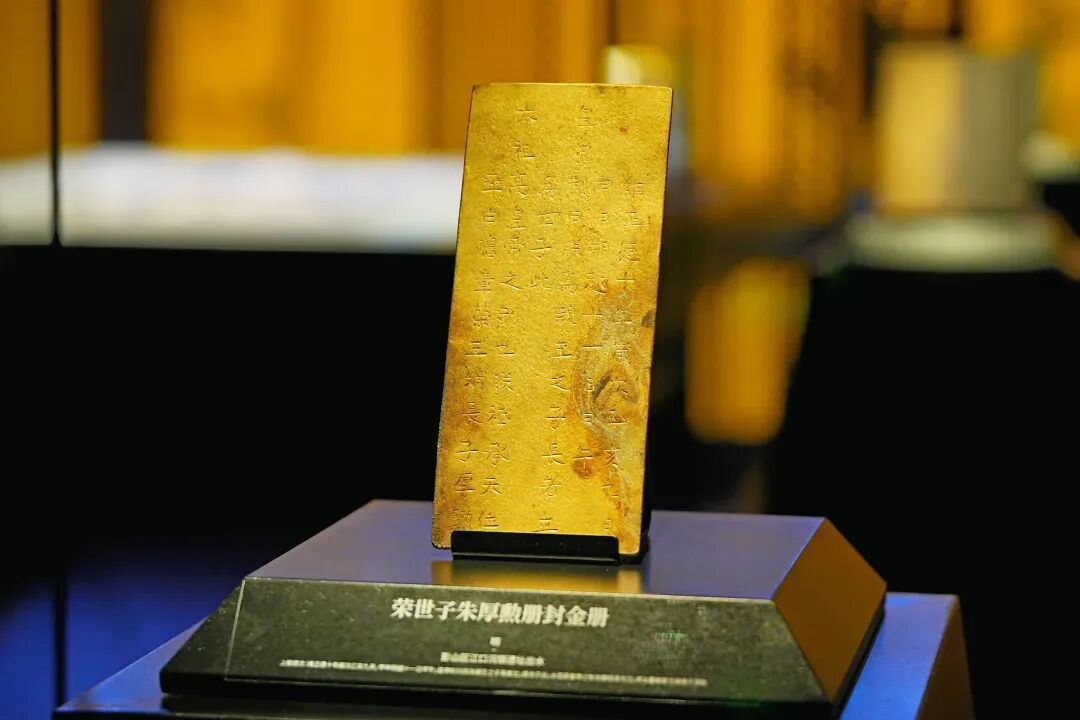 嘉靖四十五年册封荣王世子朱翊鉁的金册散发着温润的金属光泽,册文“翊鉁年已长成,特封为荣世子”清晰可辨。