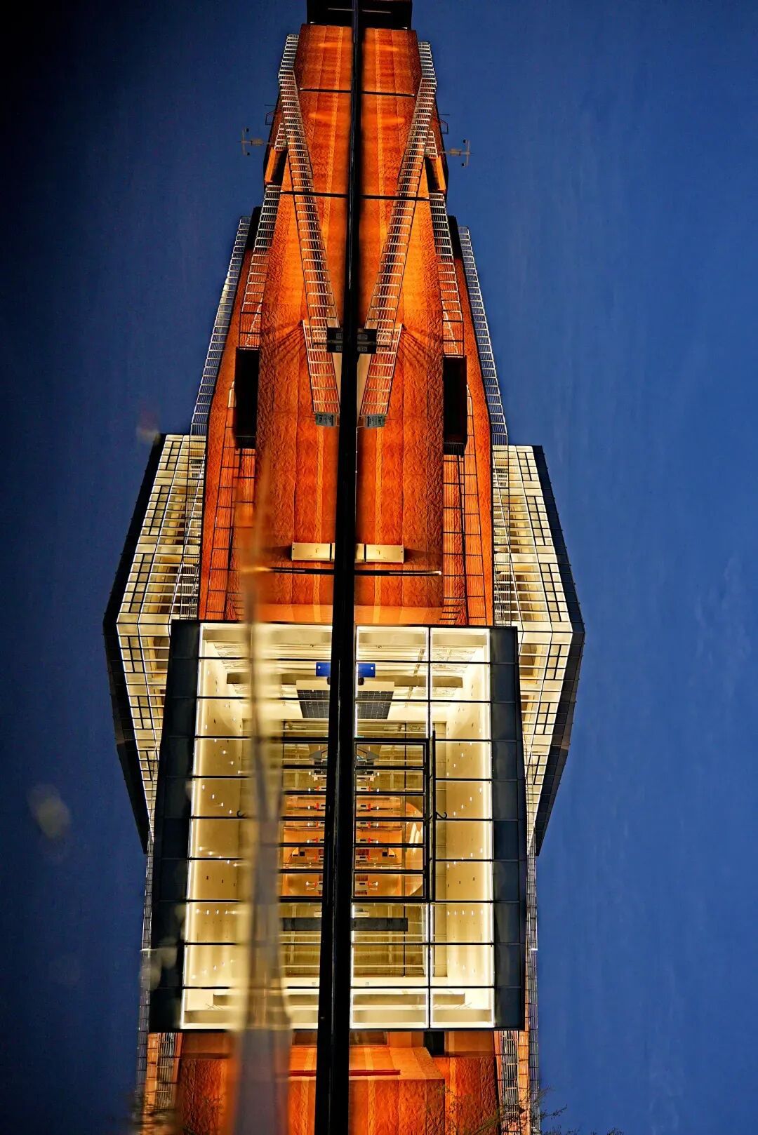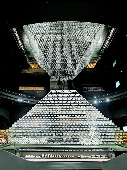 走近馆前,一汪镜面水池将整座建筑倒映其中,外立面复刻遗址河道基岩的红砂岩色彩与肌理,层层叠叠的“地质分层”效果艺术化再现“沉银出水”的历史瞬间。