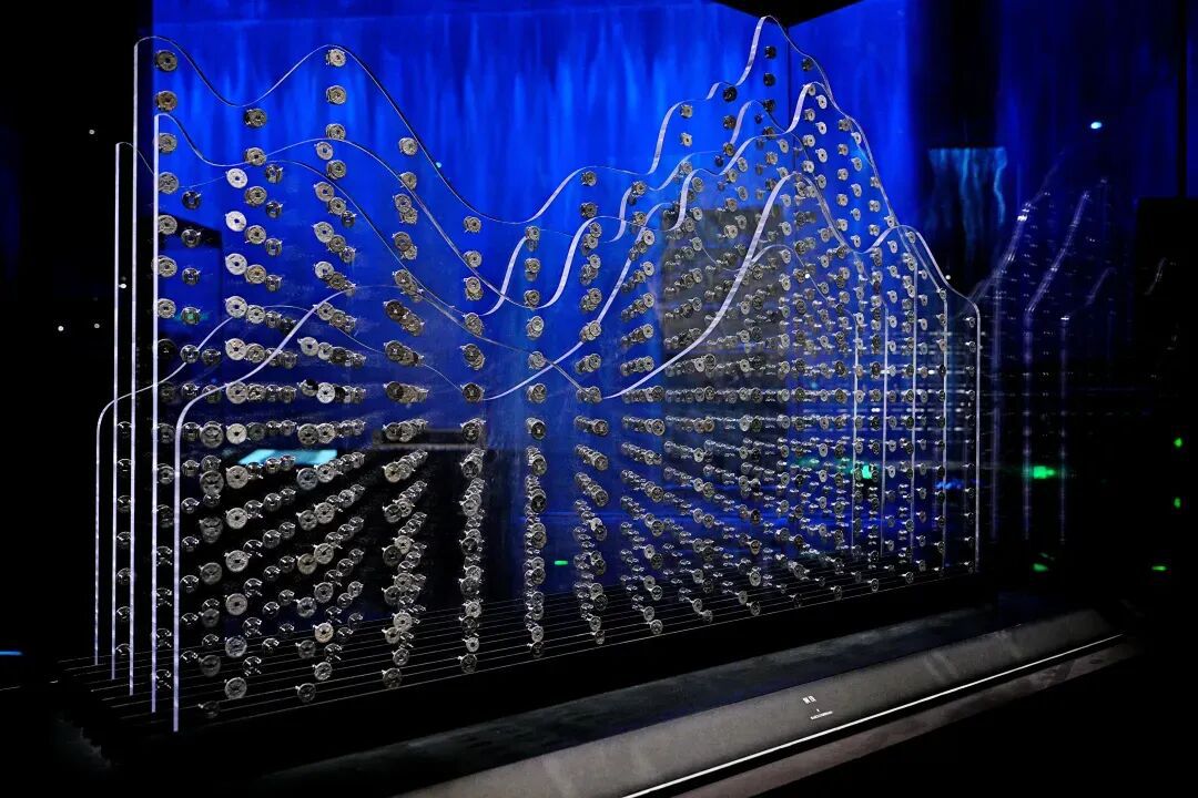 展厅内,大量钱币散落陈列,模拟出当年江底文物堆积的真实景象。