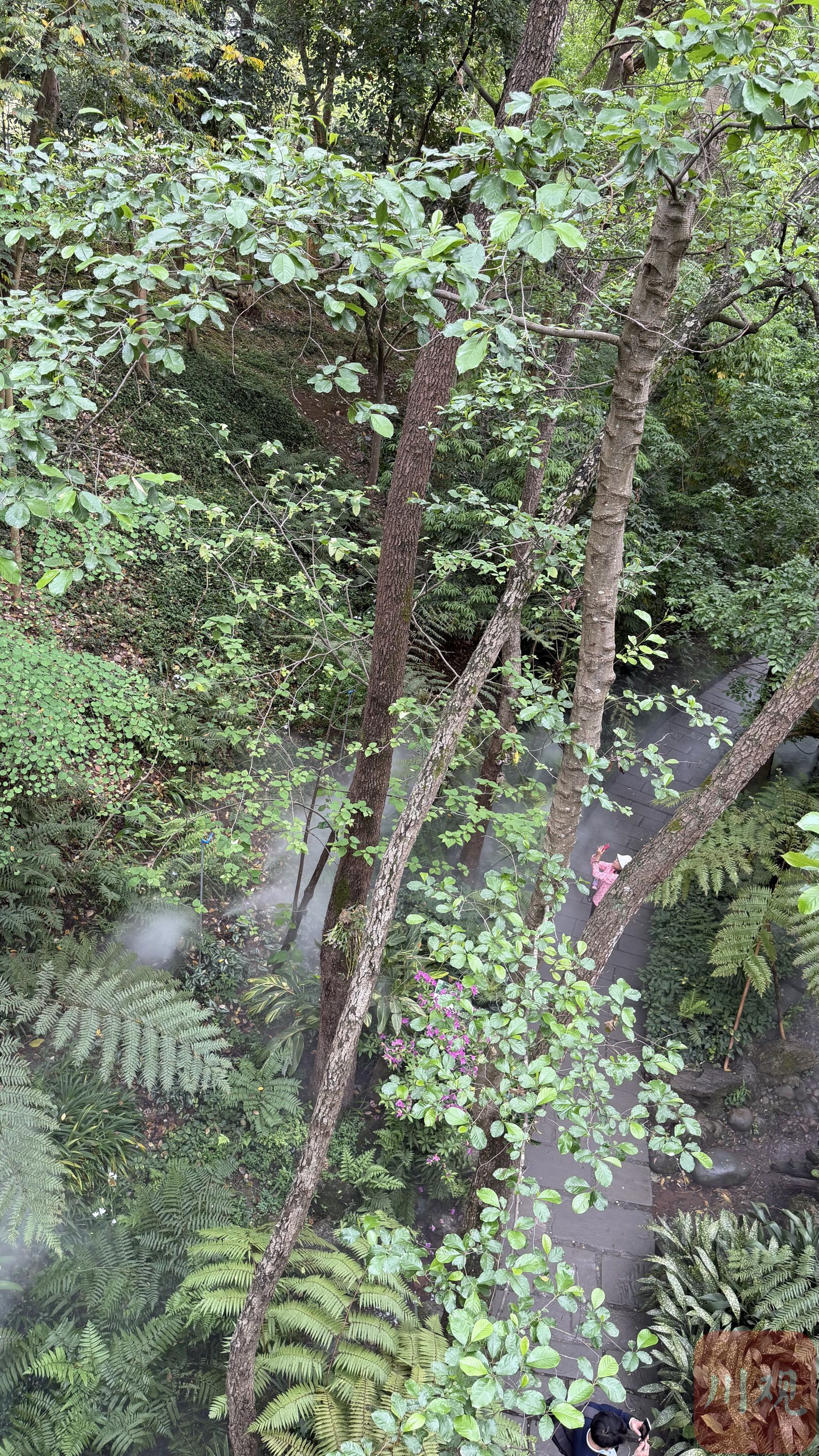成都市植物园珍稀植物园,模拟沟谷雨林的喷雾系统常年运转,薄雾缭绕间,珙桐、桫椤、五小叶槭等国家一、二级保护植物错落生长。