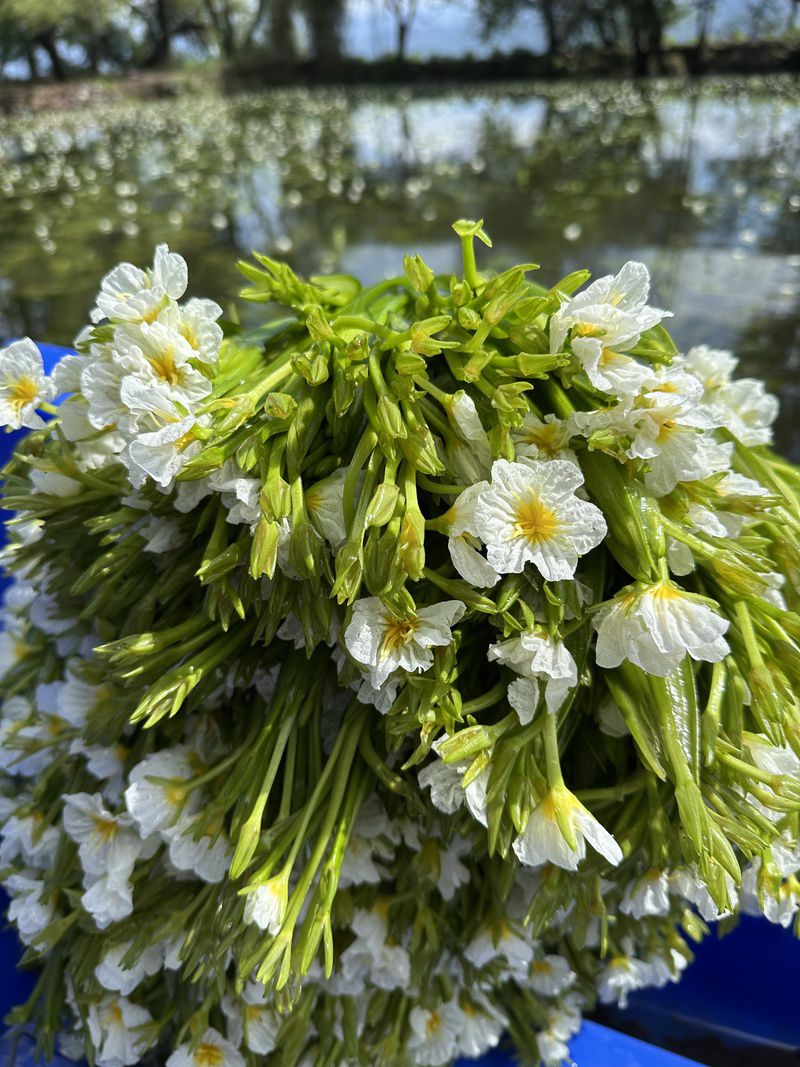得益于邛海绝佳的生态环境,这里产出的海菜花零农残、品质上乘,口感脆嫩、自带清鲜,是市场上抢手的生态食材。清晨的种植塘里,带着露水的海菜花鲜嫩欲滴,农户们小心翼翼地采摘最新鲜的花茎与花苞,当天就要送往西昌城里的特色餐馆。