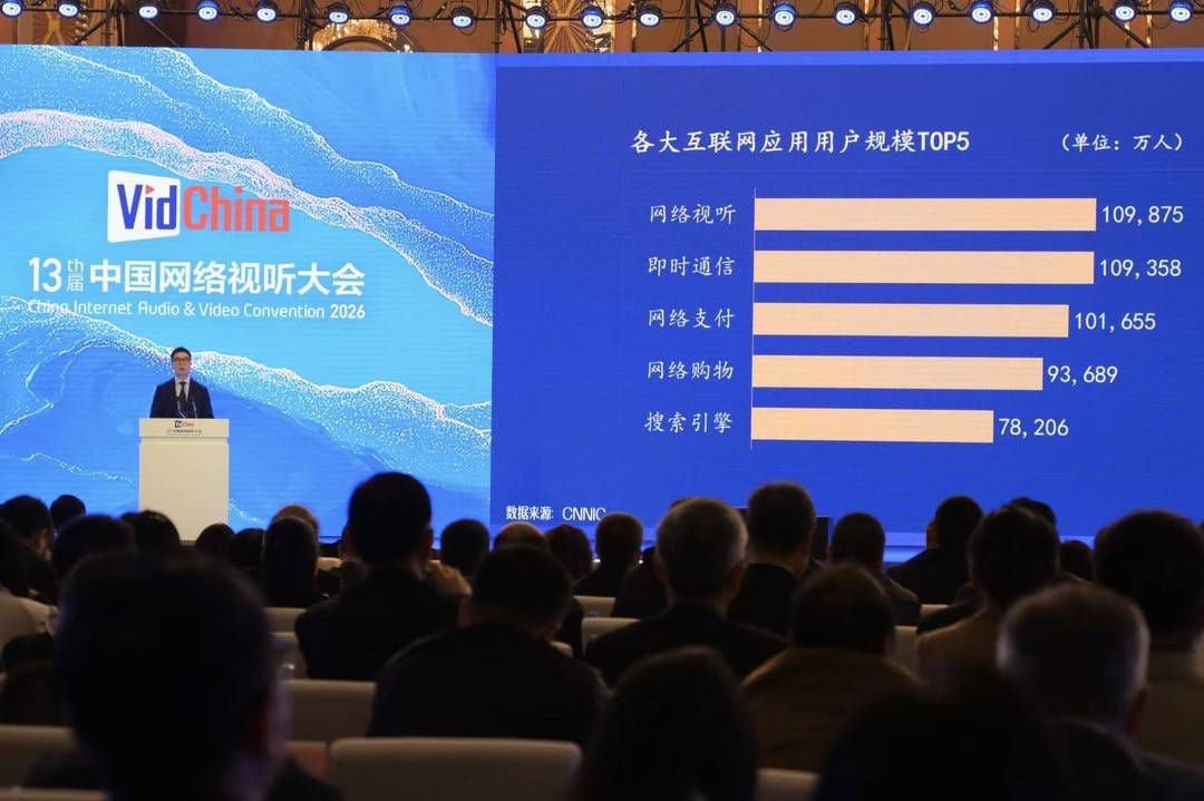 当天上午,大会开幕式现场发布《中国网络视听发展研究报告2026》,披露了过去一年行业的关键数据。数据显示,截至2025年12月,我国网络视听用户规模达10.99亿人;新入网的网民中,44.6%的人第一次上网时使用的是短视频应用;网络视听用户人均单日使用时长为201分钟,同比增长4.2%。