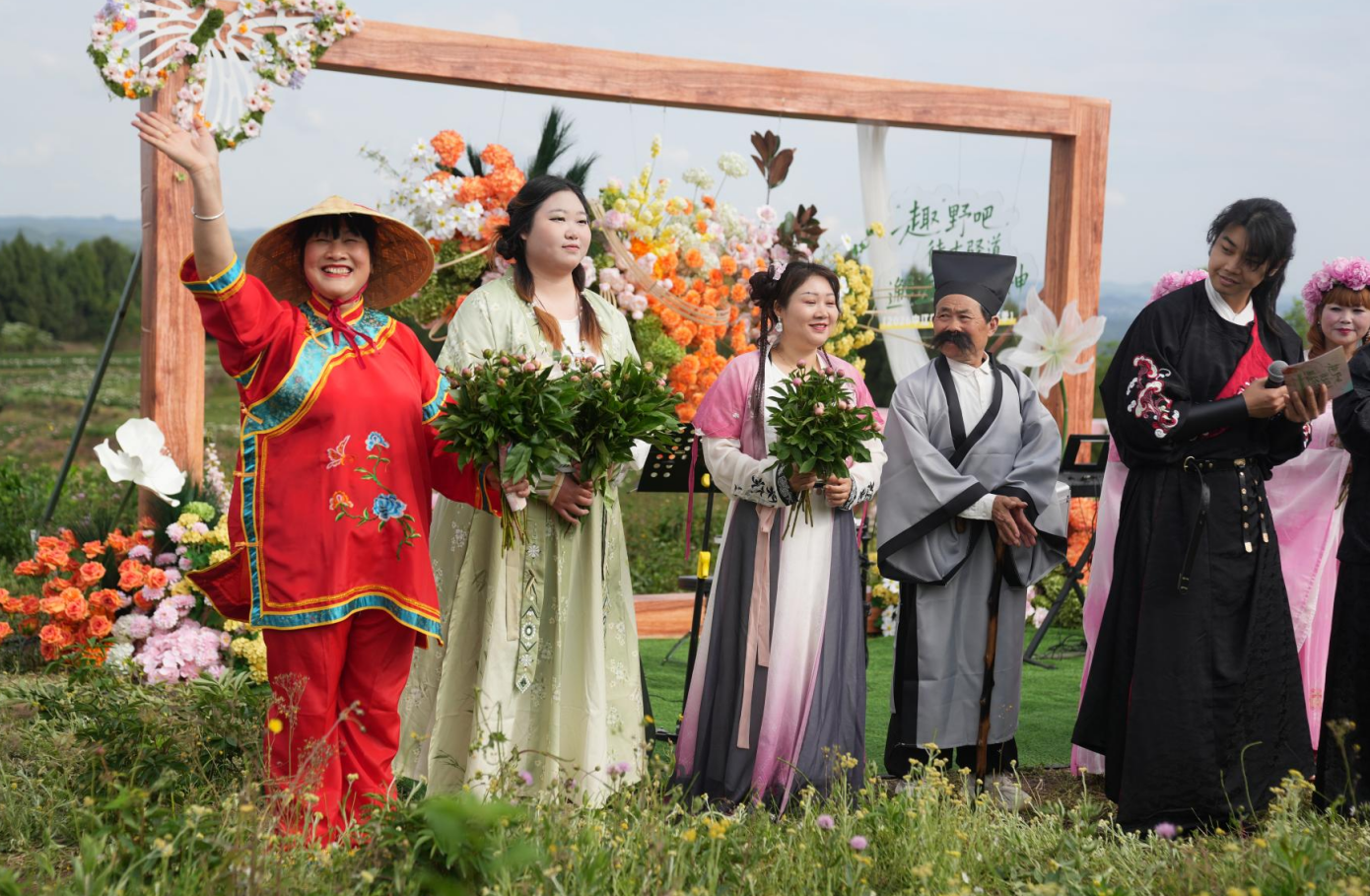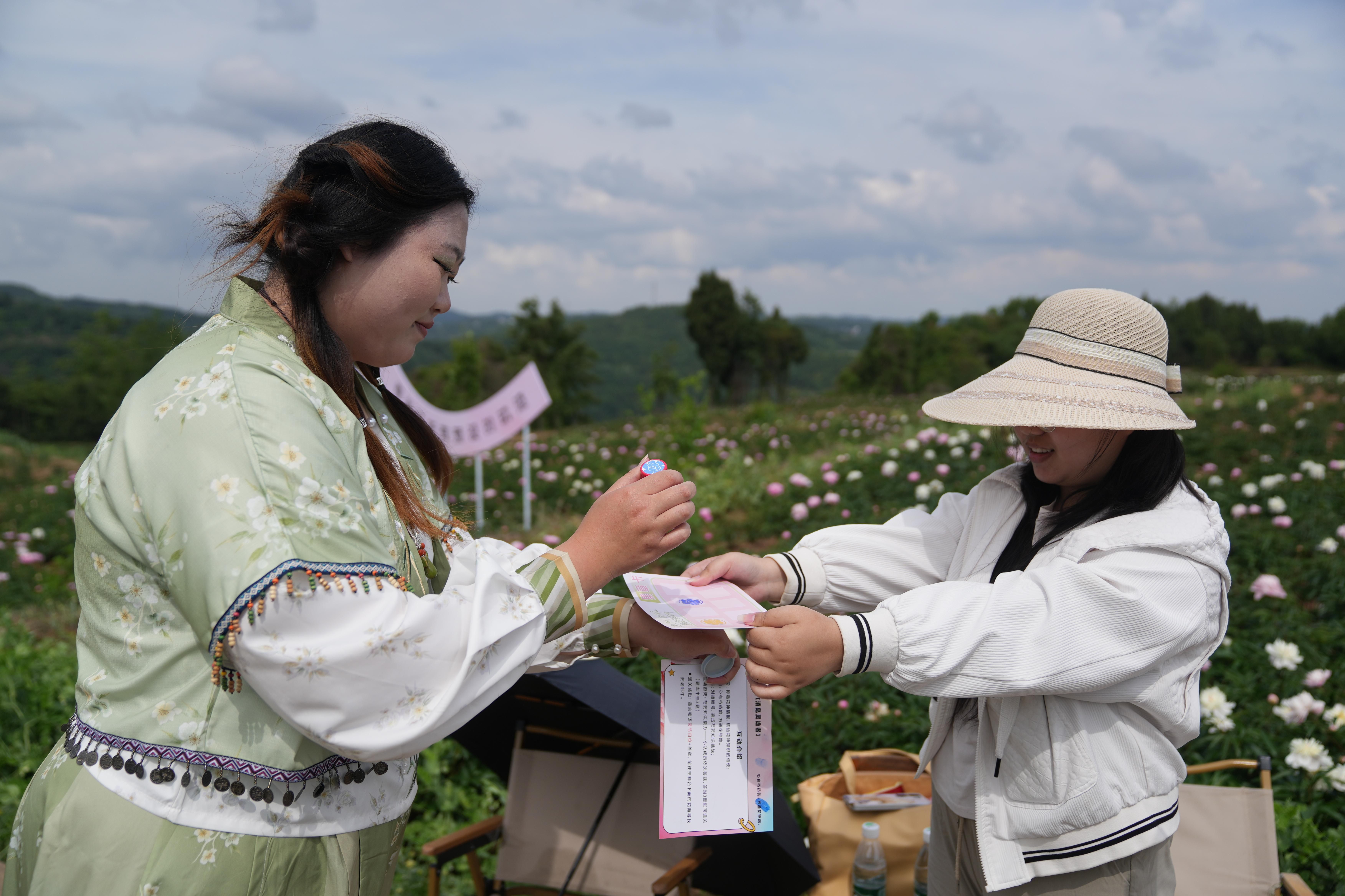 获得通关印章,拿到通关密语,一行人直奔“步步生花道”。林阿婆早已在花海中等候,笑着对上暗号:“花开花落有定时,花瓣只认懂花人。”“阿婆,我们打卡好啦,您看行不行?”游客们举着手机凑上前,摆出芍药花同款姿势合影。阿婆一边点头一边叮嘱:“拍好看点,把我们中江芍药谷拍得美美的!”“必须的!这么美的花,必须刷爆朋友圈!”游客们笑着回应。