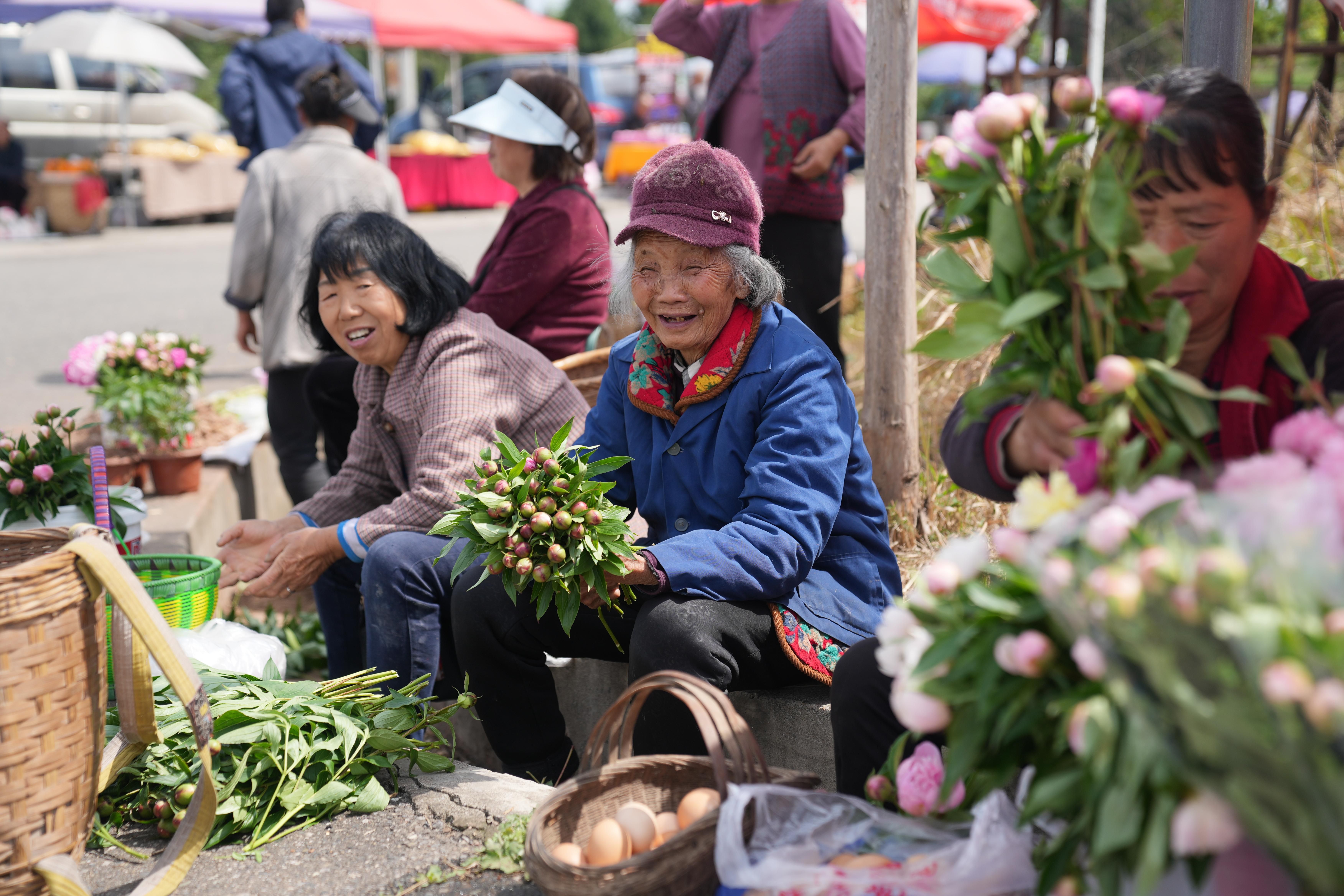 活动现场笑声连连,花海沿线的村道上也是热闹非凡。当天,93岁的丰世平带着自家的鲜切花在路边售卖,销量好得她合不上嘴。34岁的向宗林也带来培育的芍药高端品种——巴茨拉、红富士,引得不少游客驻足。以芍药为媒、以剧本杀为桥,在中江县集凤镇,乡村文旅已从单一观赏变成沉浸式体验,芍药产业也从规模种植走向全链发展。